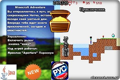 Ты выходишь из своего домика для поиска сокровищ Нотча, убивая по дороге монстров, разгадывая головоломки. Всего в java-игре 8-ь увлекательных уровней. Чтобы пройти в тебе необходимо не только собрать все алмазы, но и остаться в живых. Год выпуска/Year of issue: 2012 Жанр/Genre: Приключения Категория/Category: Java игры/Java games Размер экрана/Screen size: 240x320 Разработчик/Developer: Aperture Платформа/Platform: Java Формат файла/File format: .jar Вид устройства/Appearance of the device: для телефонов/for phones Язык интерфейса/Interface language: русский (RU) английский (ENG) Размер/Size: 1,46 Mb Статус игры/The status of the game: бесплатная/free Подготовил/Prepared by: FileFast